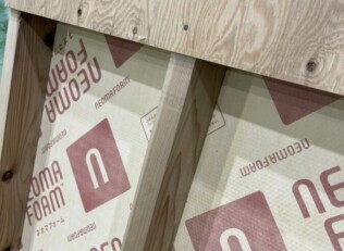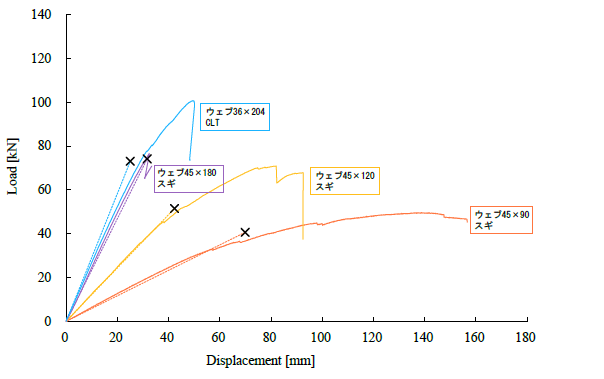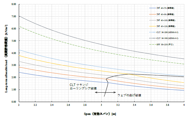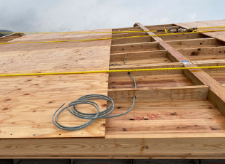 45×90~程度のタルキ断面のウェブ材と上面の合板などの面材をあらかじめ接着することにより、たわみに対する使用性を格段に向上させています。