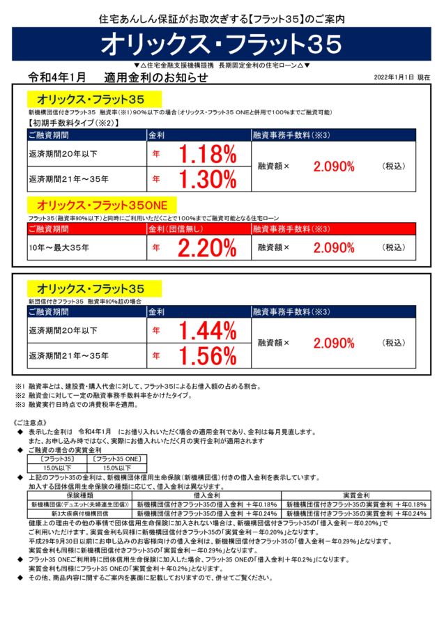 住宅あんしん保証の長期固定金利住宅ローン【フラット35】2022年1月の金利情報をお知らせいたします。